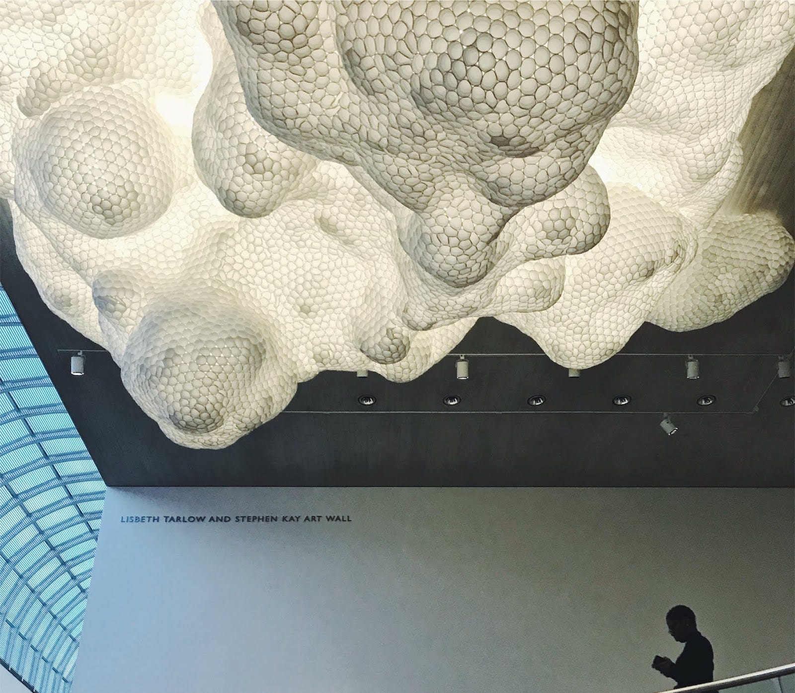 Tara Donovan, Untitled, 2003. MFA Boston. Medium: Styrofoam cups, hot glue, white thin rope, aluminum structure.